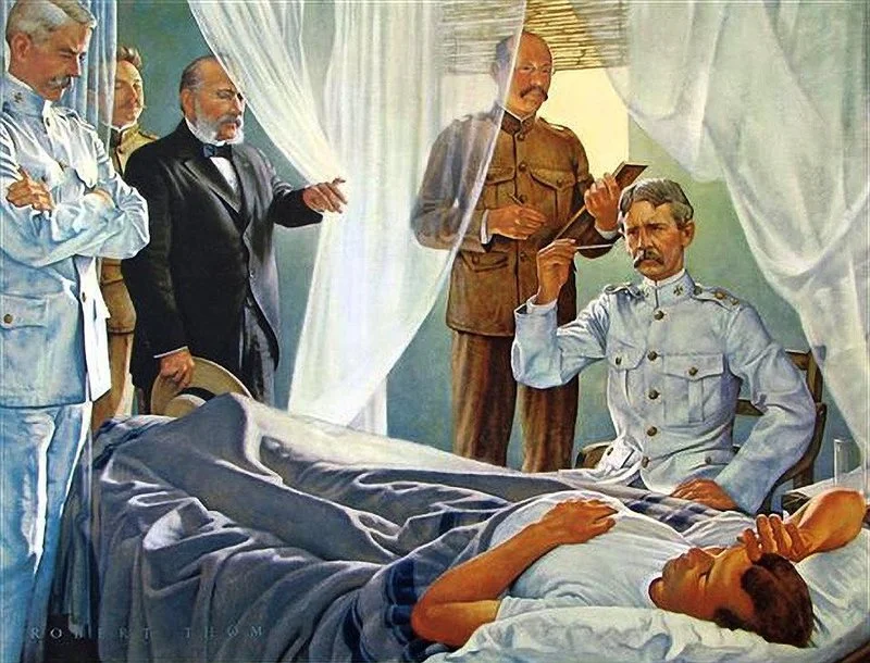 / MEDSTEG CoМетоды борьбы с желтой лихорадкой были разработаны в результате исследований, проведенных в 1900 году в Кэмп-Лазире, Куба, Комиссией армии Соединенных Штатов во главе с майором Уолтером Ридом.