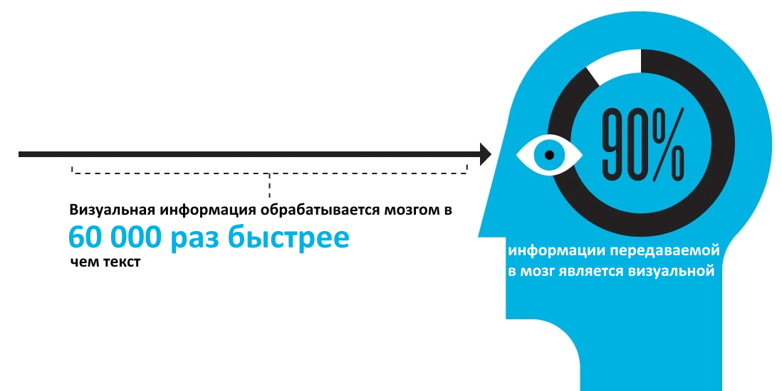 Наш мозг обрабатывает визуальную информацию с невероятно высокой скоростью. По одной из оценок, в 60 000 раз быстрее, чем текст.