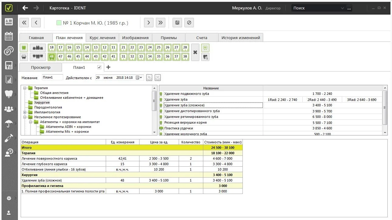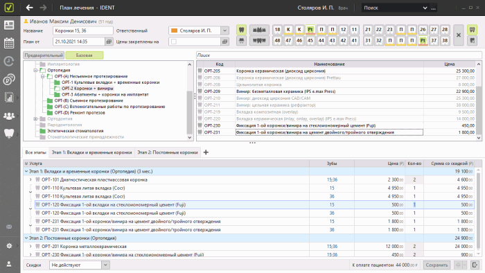 Пациенту можно распечатать и предложить в удобном для сравнения виде несколько планов лечения — рекомендованный, оптимальный, самый экономичный. Окончательный план можно распечатать подробным — с этапами, сроками и ценами.