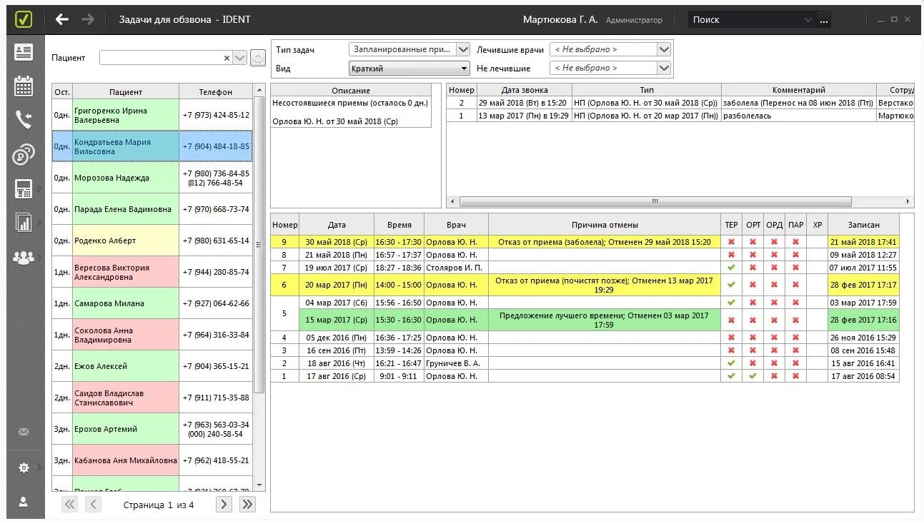 Принимая звонок, администратор увидит информацию о пациенте и сможет обратиться к нему по имени. Состояние личного счета покажет, нужно ли напомнить о задолженности. Отобразится информация о прошедших и запланированных приемах. Если пациент редко приходит на свой прием, можно не предлагать ему самое востребованное время.
