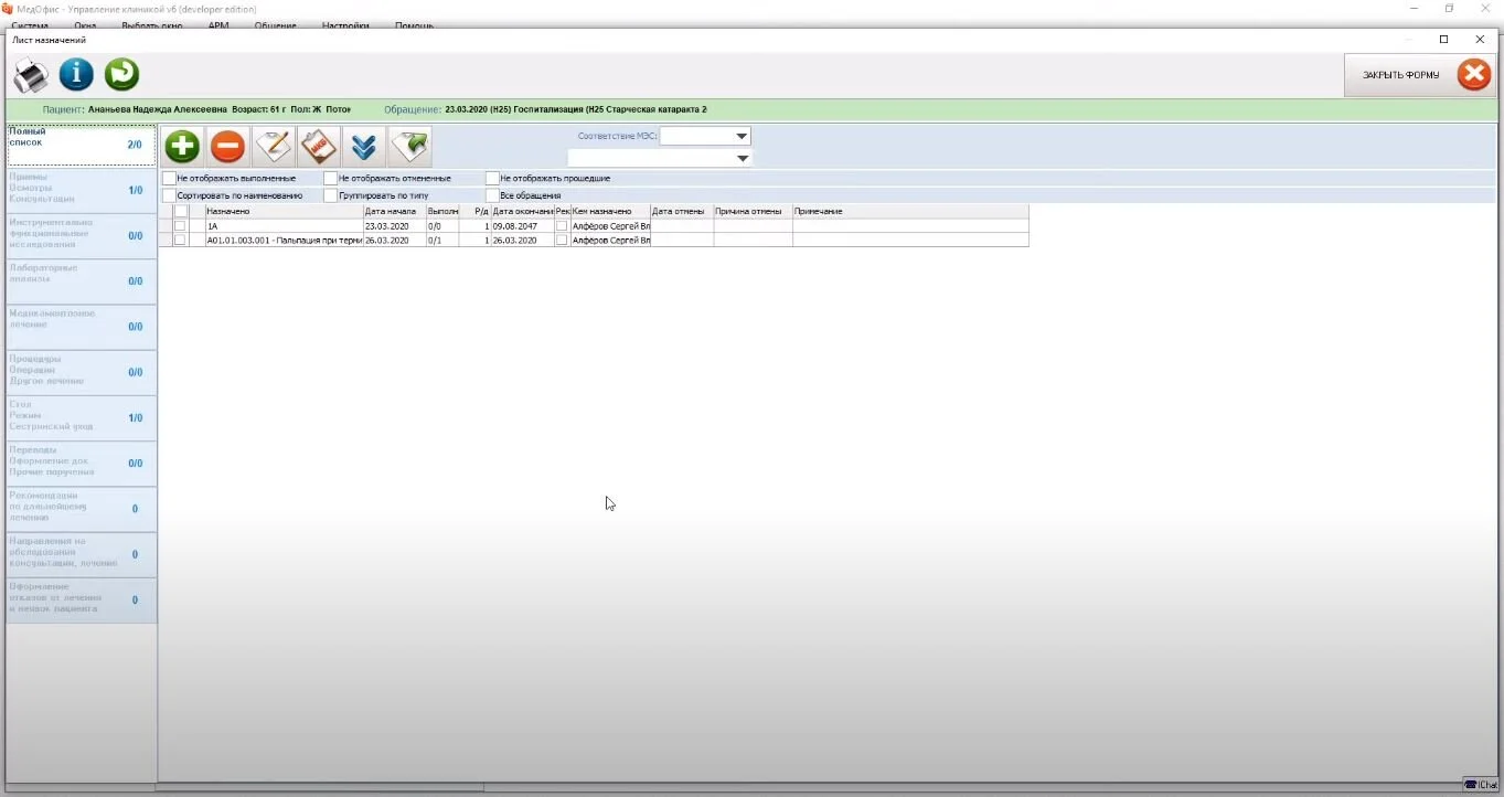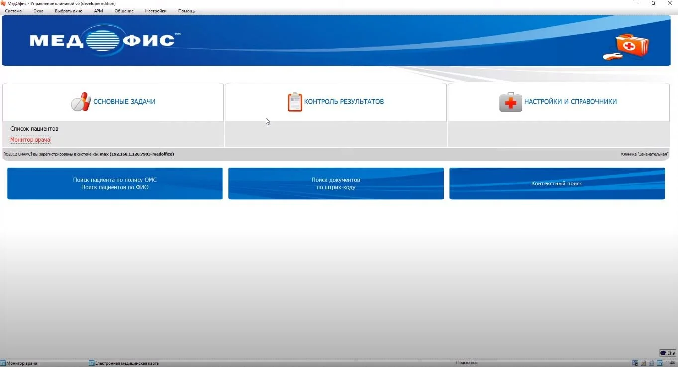 /Система для поддержки работы медицинского учреждения. Автоматизирует полный цикл взаимодействия с пациентом при оказании медпомощи в условиях амбулатории, стационара, санатория. Ведение электронной истории болезни: врачебные приёмы, лабораторная диагностика, исследования. Учет расходных материалов и персонифицированный учет медикаментов.