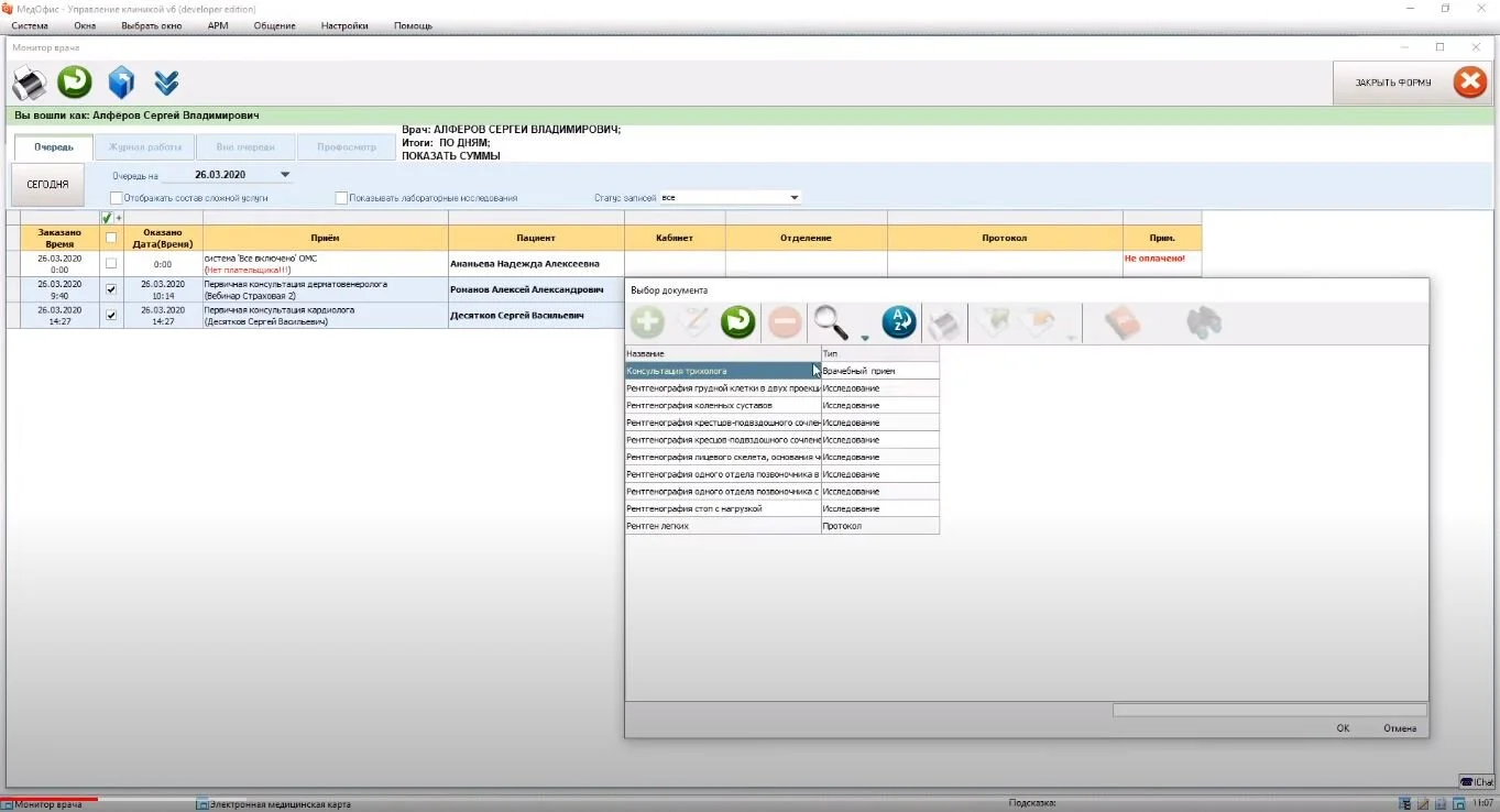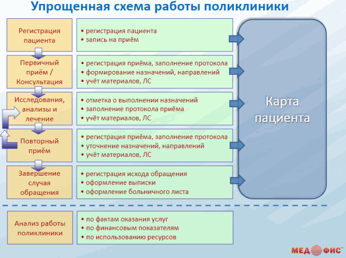 Один из основных модулей «МедОфиса», отвечающий за планирование работы врачей и управление очередями пациентов. Этот модуль представляет собой специализированный интерфейс, связывающий базу данных врачей больницы, расписание работы врачей и базу данных пациентов. С помощью программы легко автоматизировать запись пациентов на прием и оптимизировать работу врачей, контролировать нагрузку на них, повысить эффективность использования площадей, оборудования и персонала больницы.