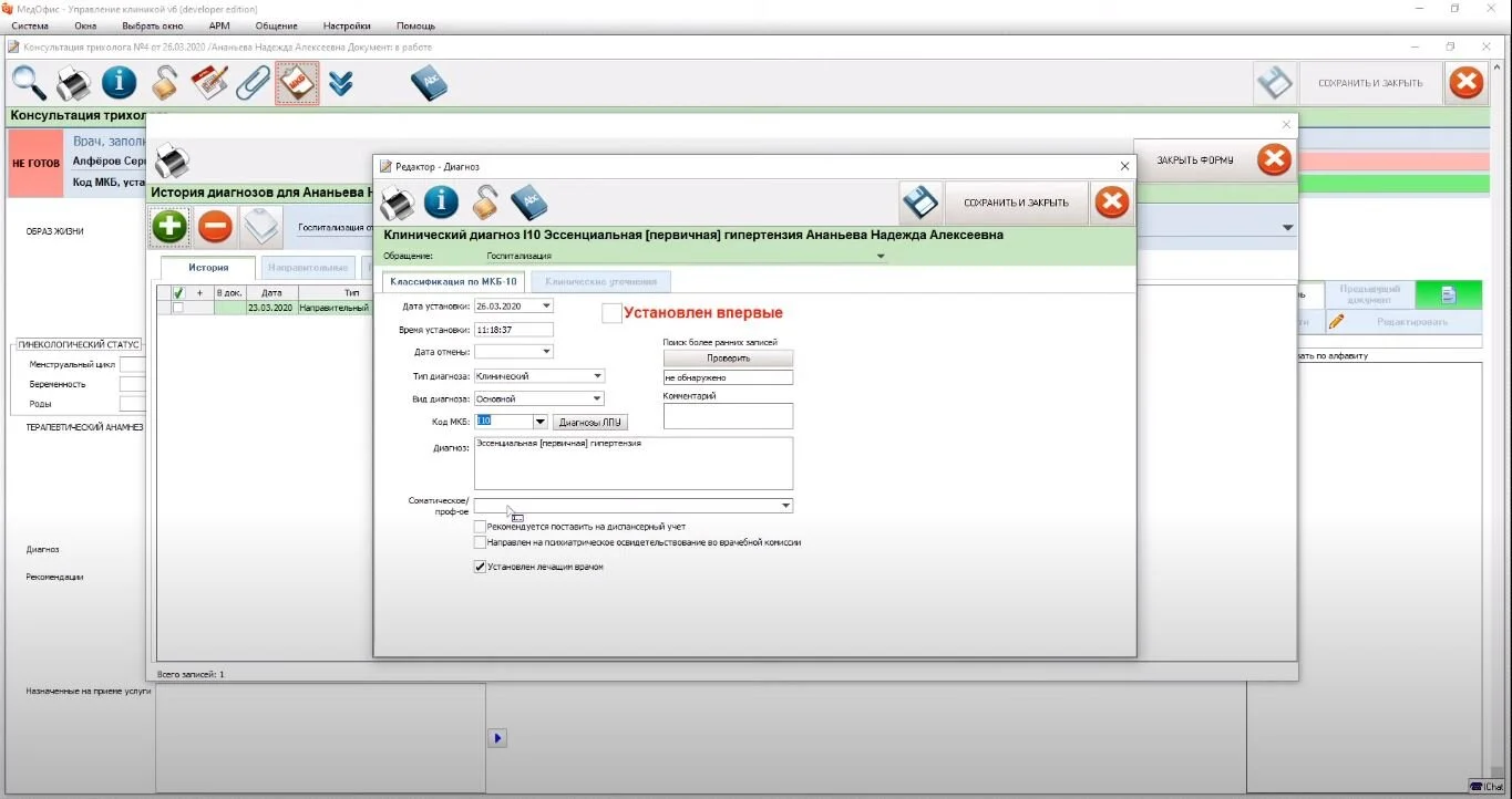 Регистрация диагноза, ведение истории диагнозов по типам (при поступлении, клинический, при выписке и т.д.)